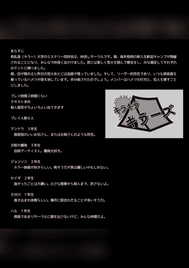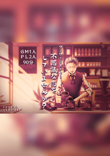 GMをしています。 気になることがあればお気軽にDM、メールでご質問下さい。 白岩ぱんだ様作品 物語回想マーダーミステリー「シュレーディンガーの密室」オリジナル版(ダブルGM) 物語回想マーダーミステリー「パンドラの箱の再開」 読み合わせストーリープレイング「されど魔女裁判は開かれる」 AGATA様作品 イマーシブ・マーダーミステリー「遠き明日への子守唄」 とんとん様作品 ストーリープレイング「天使は花明かりの下で」 マーダーミステリー「殺人鬼イバラノミチの回想録」 すな様作品 マーダーミステリー「コーヒーカップが割れたとき」 マーダーミステリー「オオカミ少年の挽歌」 マーダーミステリー「あの木漏れ星にゆびきりを」 週末倶楽部様作品 読み合わせマーダーミステリー「ミステリーは黒猫と」
