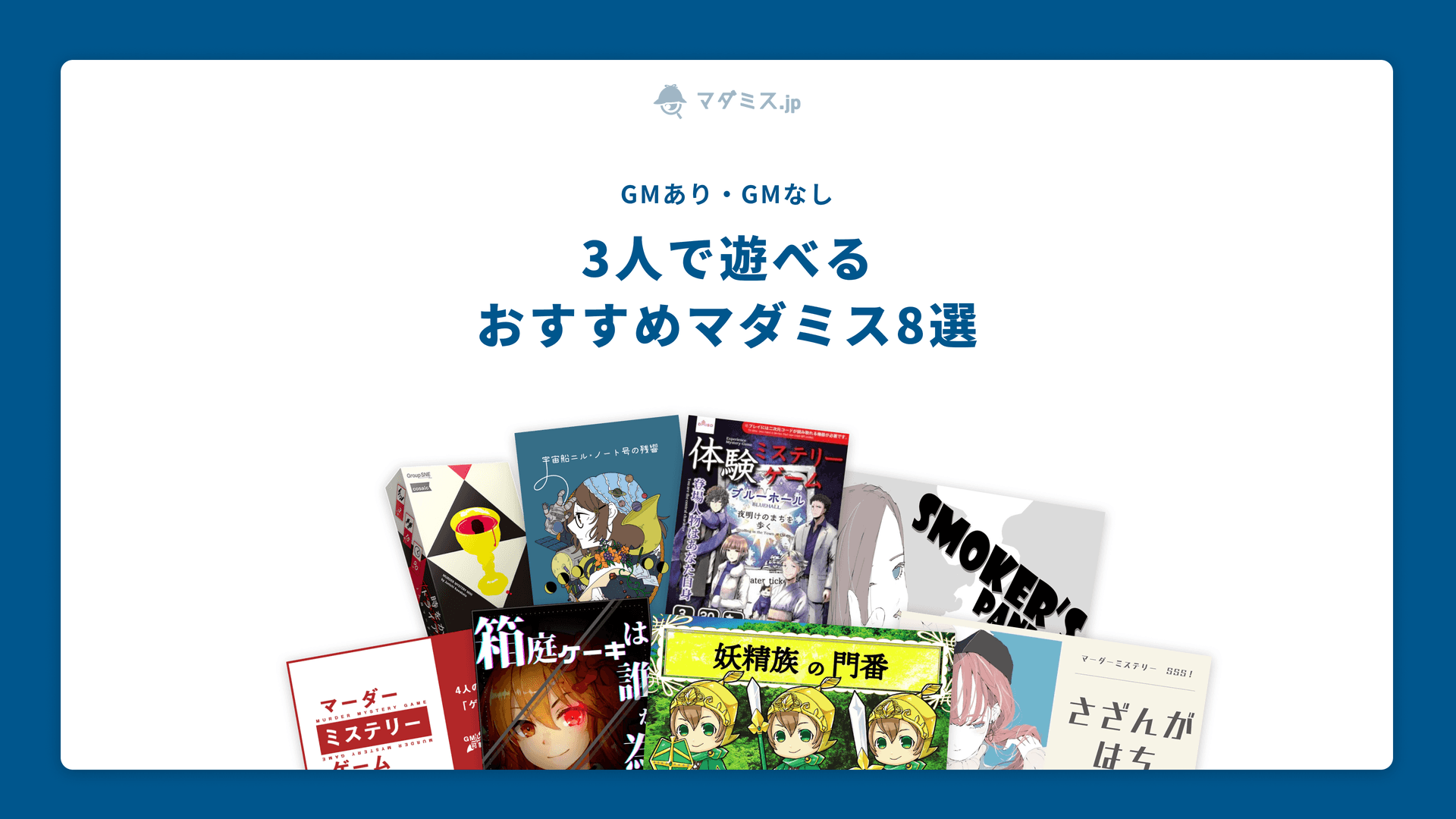 GMレス可・GMあり、オンライン・オフラインの3人用のマダミス8作品を紹介しました。